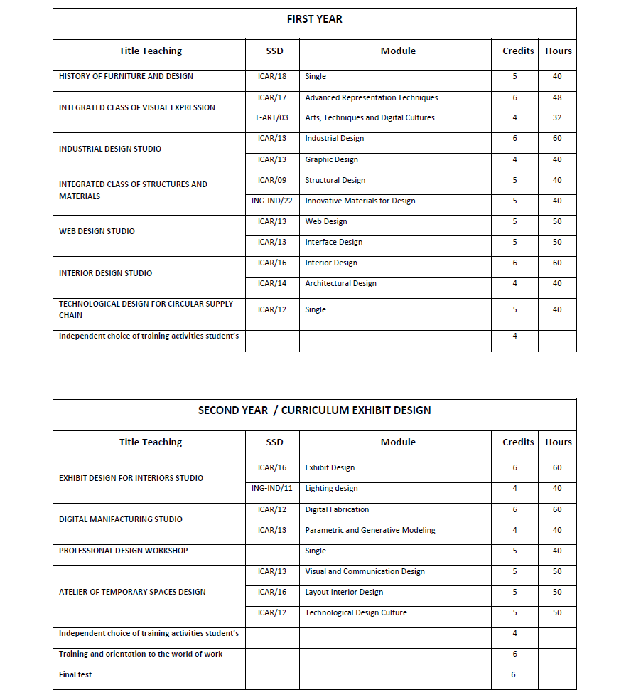 The ‘Exhibit Design’ curriculum intends to train specialised figures in the field of applied design to interiors, to the components and systems that define them, to the objects and artefacts that equip them, to the communication of the contents and values expressed, with particular reference to the principles of living in the domestic sphere, to temporary, museum and commercial fittings, to the staging of events and shows, to set design and all the objects, furnishings, structures and components capable of determining the quality and performance of space, whether they derive from industrial production or from craft-type production chains.