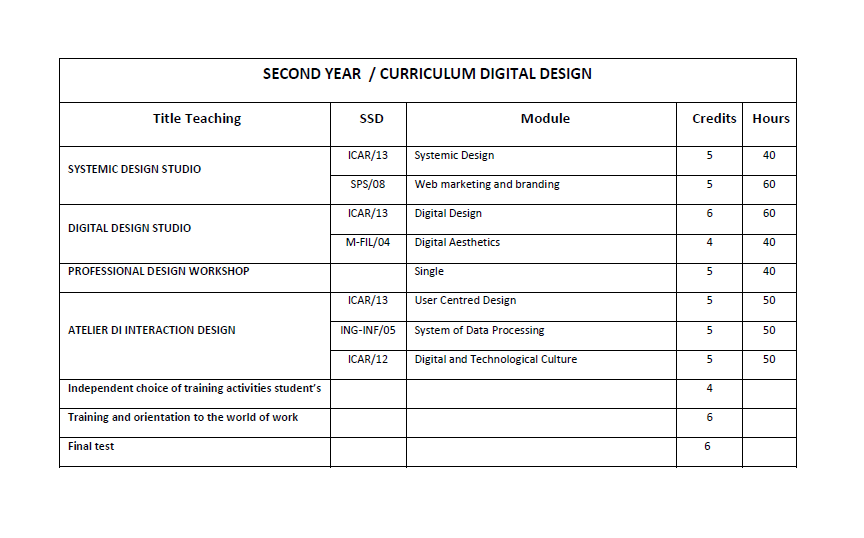 The ‘Digital Design’ curriculum intends to train specialised figures in the sector of the production of digital products, services and systems, strongly oriented towards innovation, in which the component of digital and communicative interaction is pre-eminent, who know how to dialogue with an evolved and emerging clientele, such as that of accessibility, design for everyone, frontier themes of the digital industry, multimedia communication, augmented reality (IoT, makers, app development, user centred design, interaction design, A.R.).